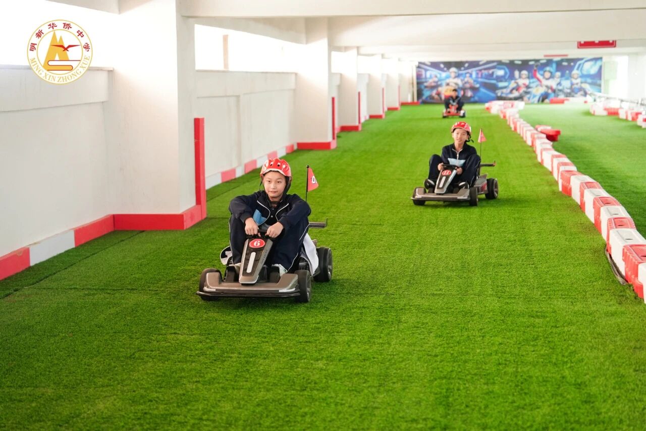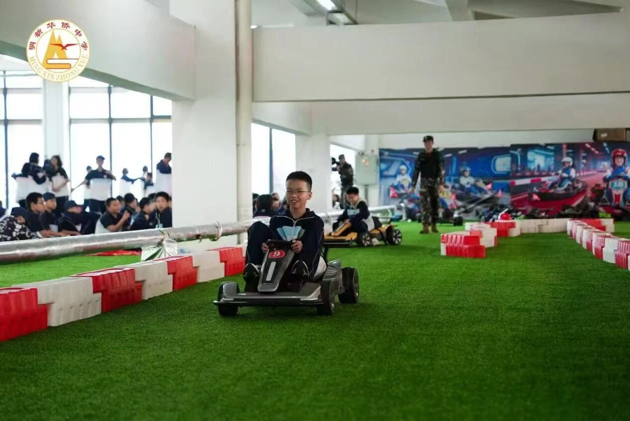 新能源卡丁车赛道上,车身轻巧地伏在路面,没有轰鸣的引擎声,只有轻轻踩下油门时的顺滑加速。双手握紧方向盘,指尖能清晰感受到转向的精准反馈,车轮平稳地掠过赛道,风带着青草香温柔地拂过脸颊——没有刺耳的噪音,只剩掌控方向的专注与风驰电掣的畅快,连第一次尝试的同学都能慢慢找到节奏,笑着把速度再提快一点。
