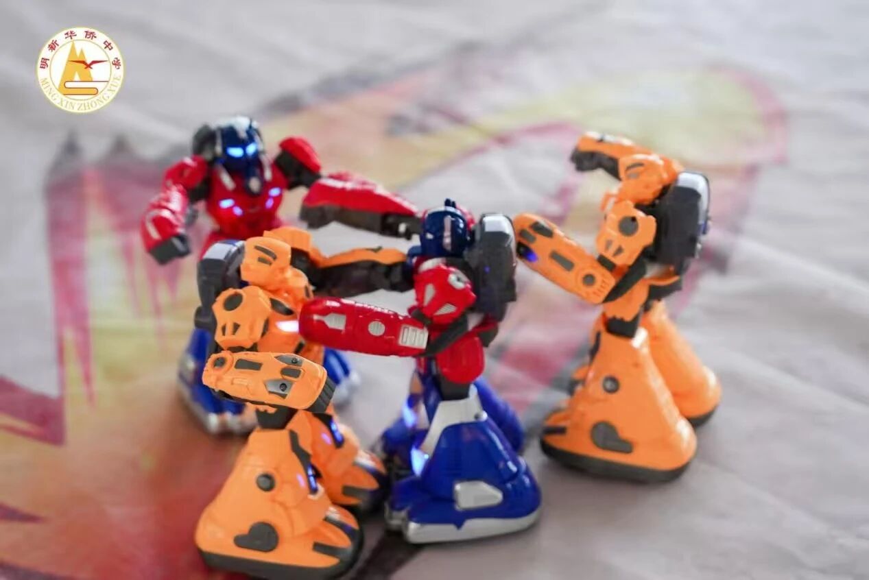 格斗机器人对战台旁,几台金属质感的“战士”正展开激烈对抗:红色机器人率先出拳,机械臂带着“咔嗒”的咬合声直逼对手;蓝红色机器人迅速后撤,灵活转身绕到侧面,猛地用机械臂敲击对方机身,在“滋滋”的电流声中将其轻轻掀翻。台下的目光紧紧锁着对战台,每一次攻防转换都让呼吸跟着放缓,胜负揭晓的瞬间,全场的欢呼差点掀翻头顶的天空。