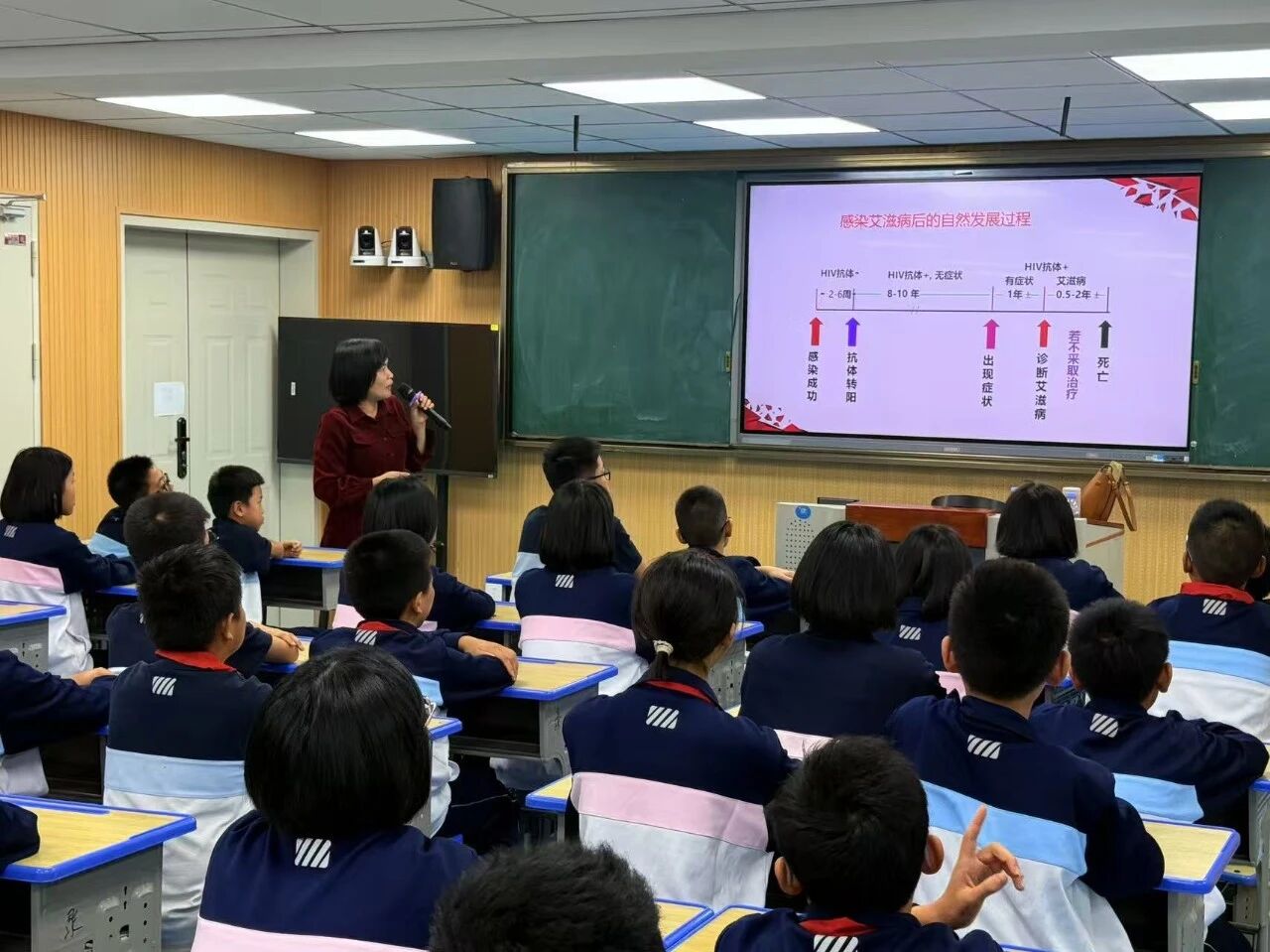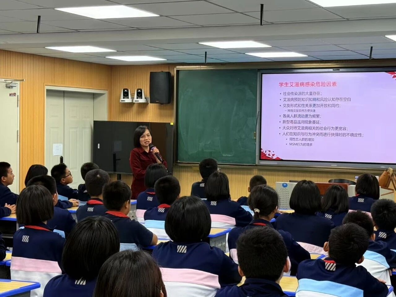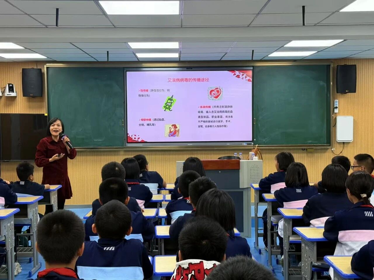 讲座现场,邓老师从艾滋病的基本知识出发,系统讲解了病原特征、传播途径与疾病进程,并剖析其对个人、家庭及社会可能造成的危害。结合青少年群体的行为特点,她重点强调了性接触、血液和母婴三种传播途径,并明确说明共餐、握手等日常接触不会传播病毒,帮助同学们科学认知、消除误区。