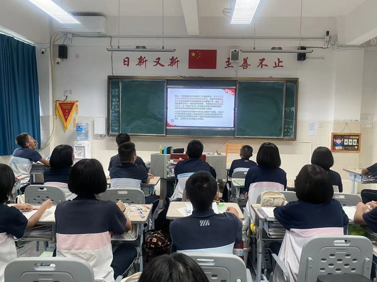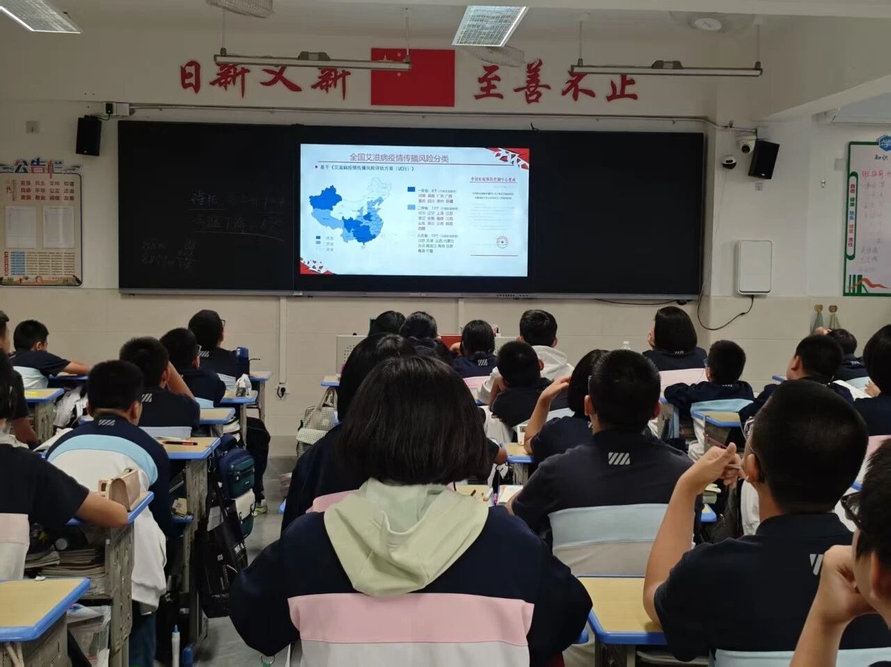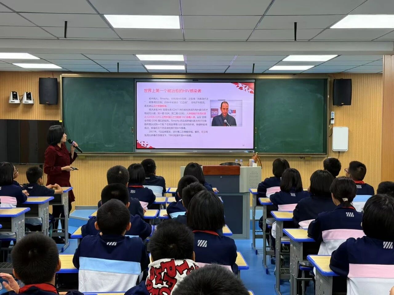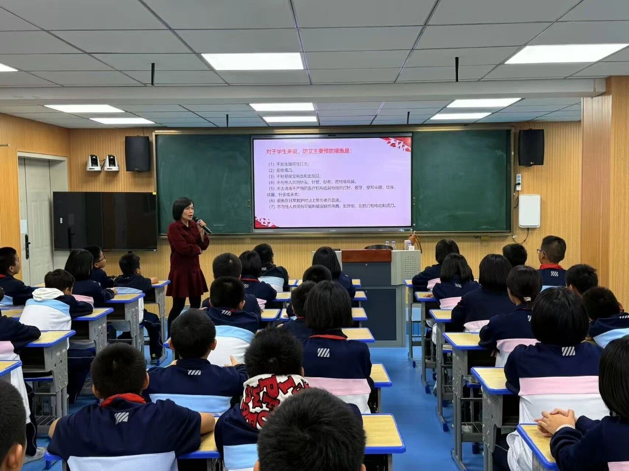 讲座现场,邓老师从艾滋病的基本知识出发,系统讲解了病原特征、传播途径与疾病进程,并剖析其对个人、家庭及社会可能造成的危害。结合青少年群体的行为特点,她重点强调了性接触、血液和母婴三种传播途径,并明确说明共餐、握手等日常接触不会传播病毒,帮助同学们科学认知、消除误区。