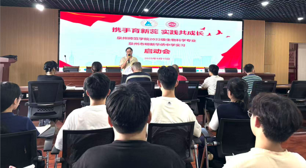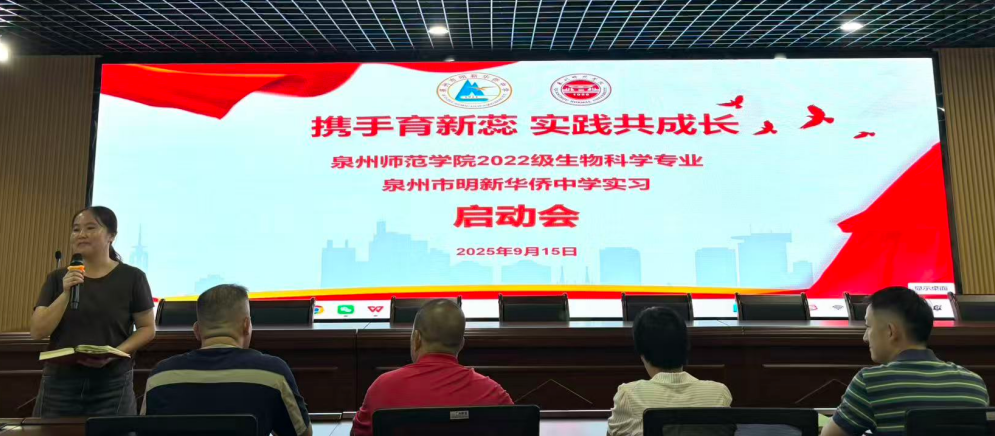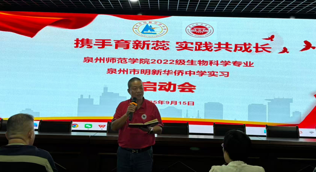 9月15日下午,我校为泉州师范学院2022级生物科学专业的实习生举行教育实习启动会。本次启动会以"携手育新蕊,实践共成长"为主题,明新华侨中学副书记吴剑雄、副校长吴晋南、副校长刘友生和各处室主任、学科指导老师、班主任代表,以及泉州师院带队老师陈细香、周明灿共同参会。