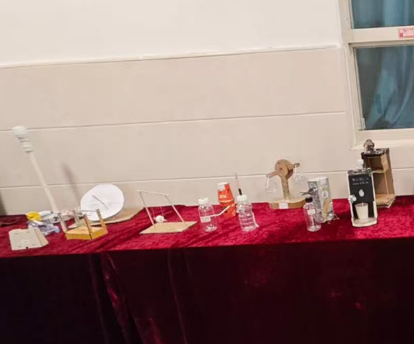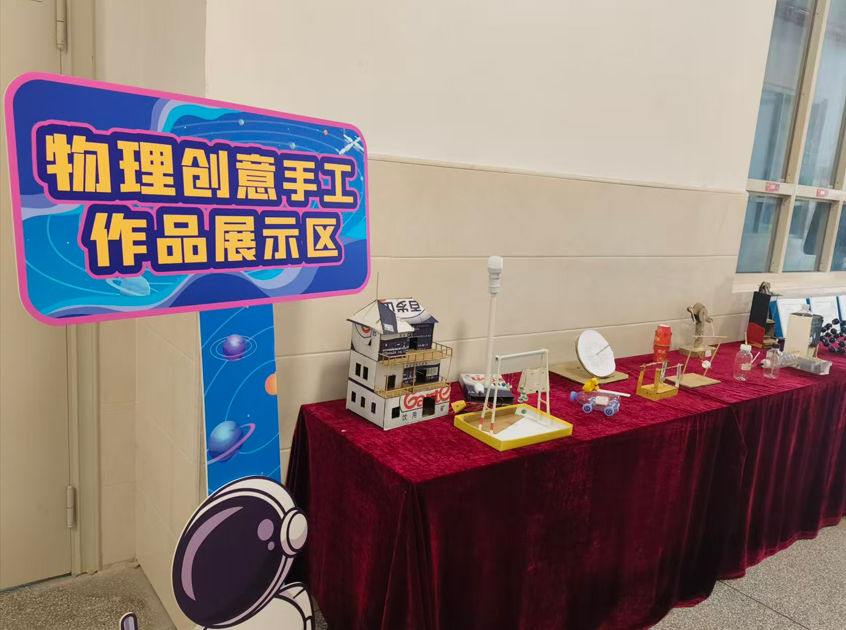 “物理创意手工作品展示” 区,一件件利用废旧材料制作的作品充满巧思。
