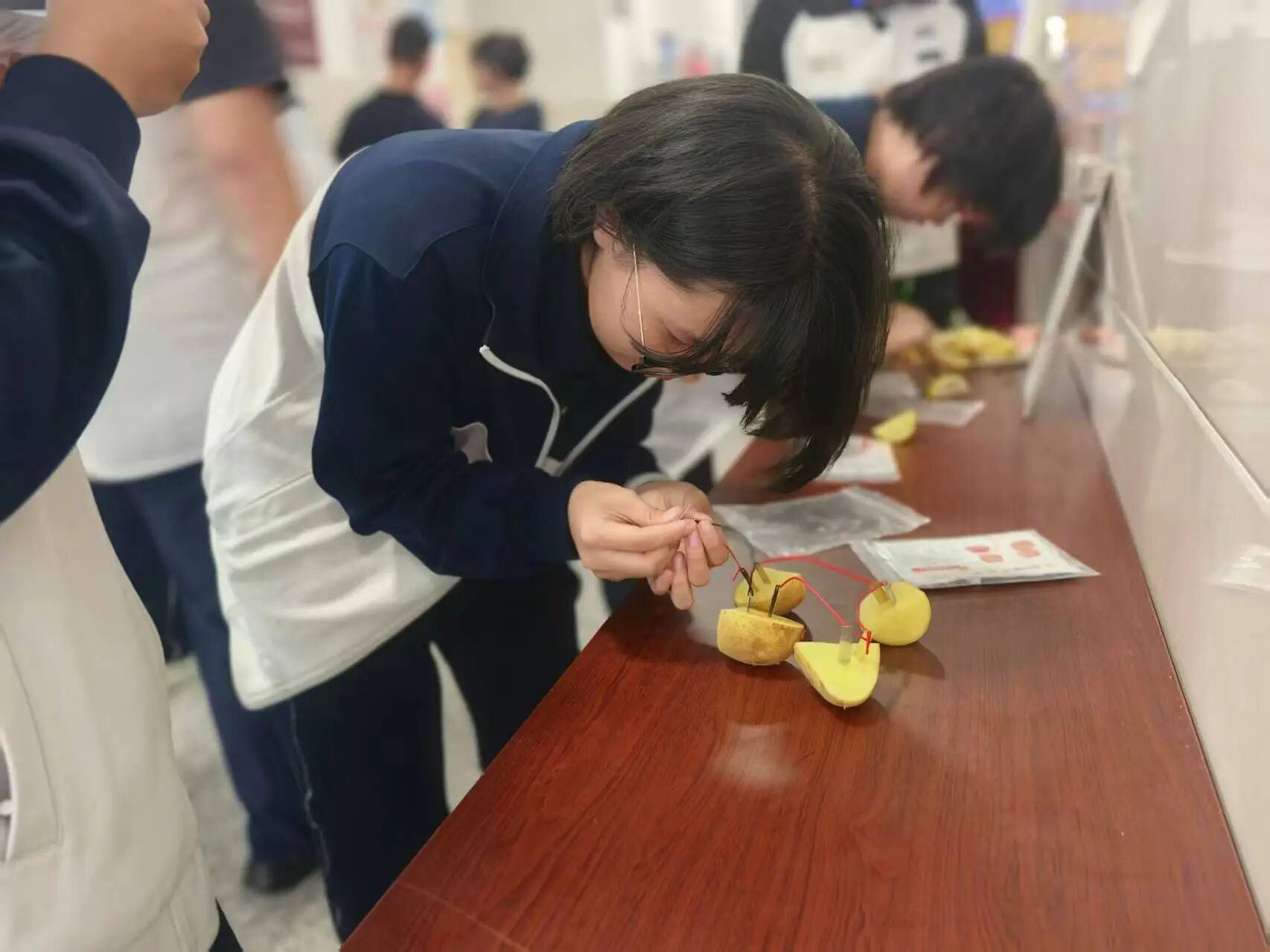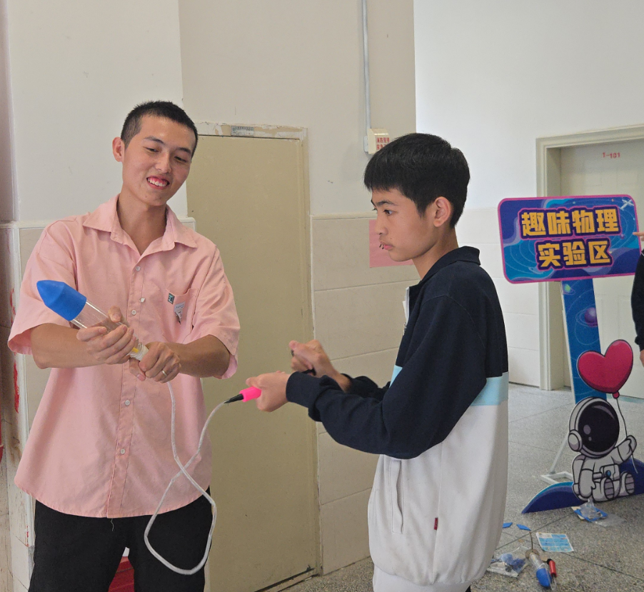 在实践会场,“趣味物理实验操作” 成为热门项目,学生们以小组为单位,精心演示 “人体导电灯泡”“制作水果电池”“静电章鱼”“水火箭发射” “手中生火”“大象牙膏”“烧不坏的手帕”“碘酒显影” 等实验一个个惊艳亮相,学生们在教师的指导下规范操作,近距离观察实验现象,现场不时响起阵阵惊叹声与掌声。