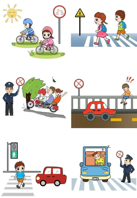 要遵守交规,不追逐打闹,不横穿马路;过马路时,一定要走斑马线,左右看,确认没有车辆再通过。记得红灯停,绿灯行,黄灯亮了等一等。
