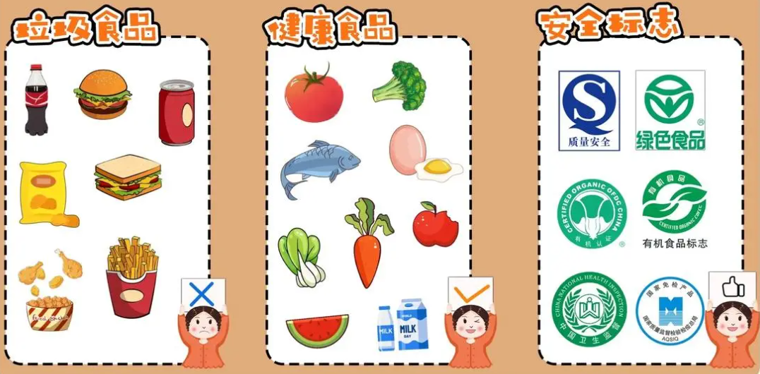 3.购买有包装的食品时,要看清商标、生产日期、保质期等,“三无”食品、过期食品一定不要购买食用。