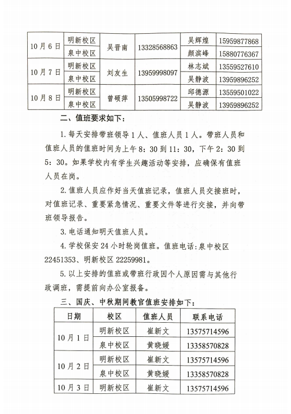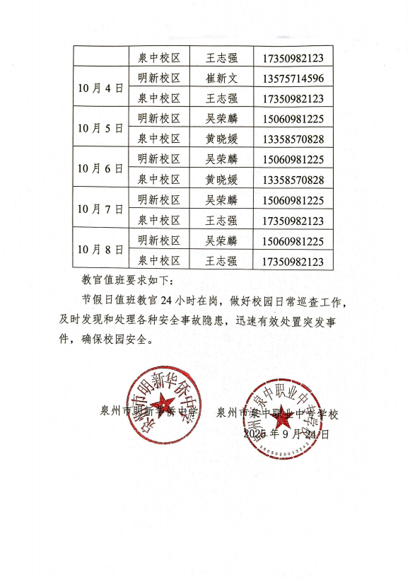 泉明中校办(2025)45号 关于2025年国庆中秋放假与值班的通知