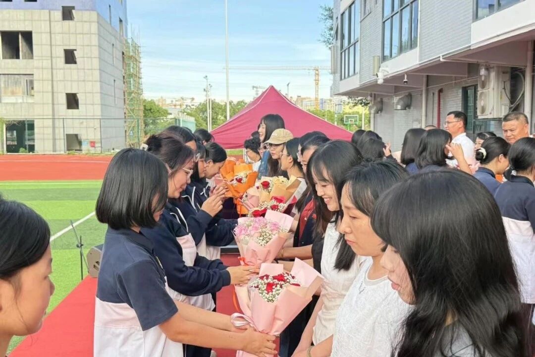 师恩如山,润物无声。学生代表手捧馥郁芬芳的鲜花,走向敬爱的班主任和全体科任老师。深深的一鞠躬,饱含着无言的感激与敬意。鲜花映衬着老师们欣慰的笑容,这一刻,三年来的付出与陪伴,都化作了心头的暖流与眼中的晶莹。