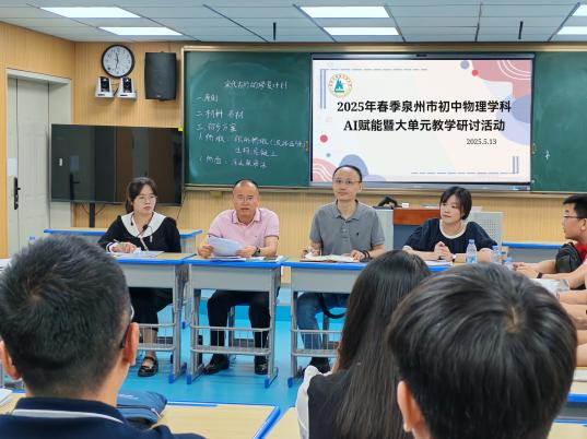 为深入贯彻落实新课标理念,探索AI技术与物理教学的深度融合,推动大单元教学实践,5月13日,泉州市初中物理学科AI赋能暨大单元教学研讨活动在泉州市明新华侨中学成功举办。各县(市、区)教师进修学校物理学科教研员、初中物理教师代表参加本次活动。泉州市教育科学研究院物理学科教研员林一敏老师主持活动。