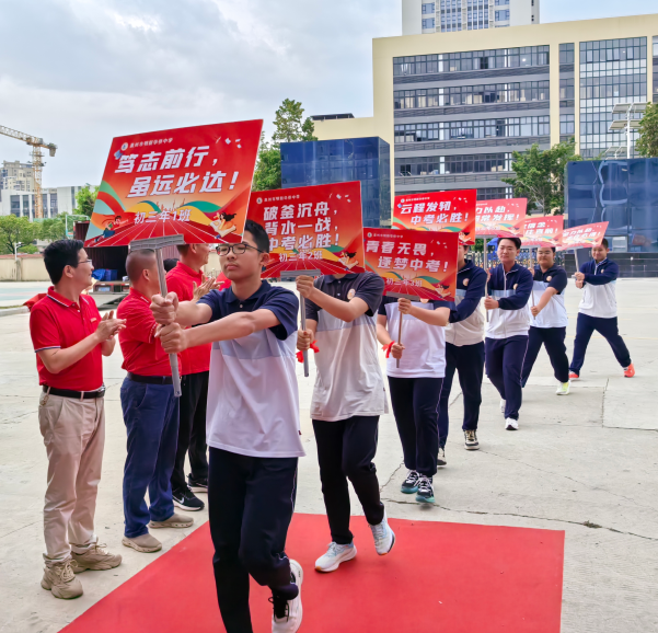 初三各班列队跑步入场!校领导与家长夹道欢呼,老师们、家长们高举双手与学子击掌助威——“加油!”“必胜!”,掌声与呐喊点燃全场,每一步都是奔向梦想的铿锵!