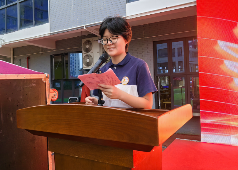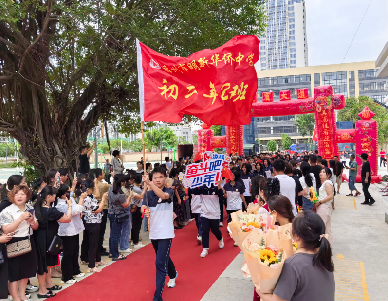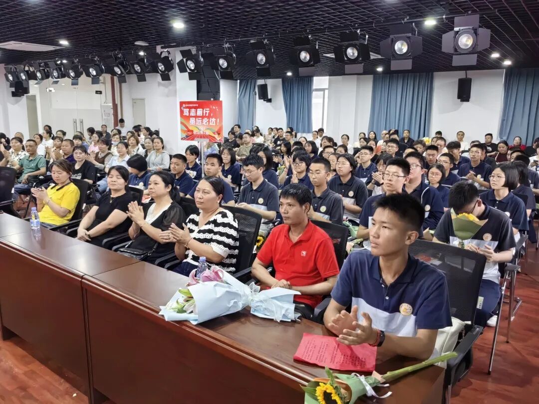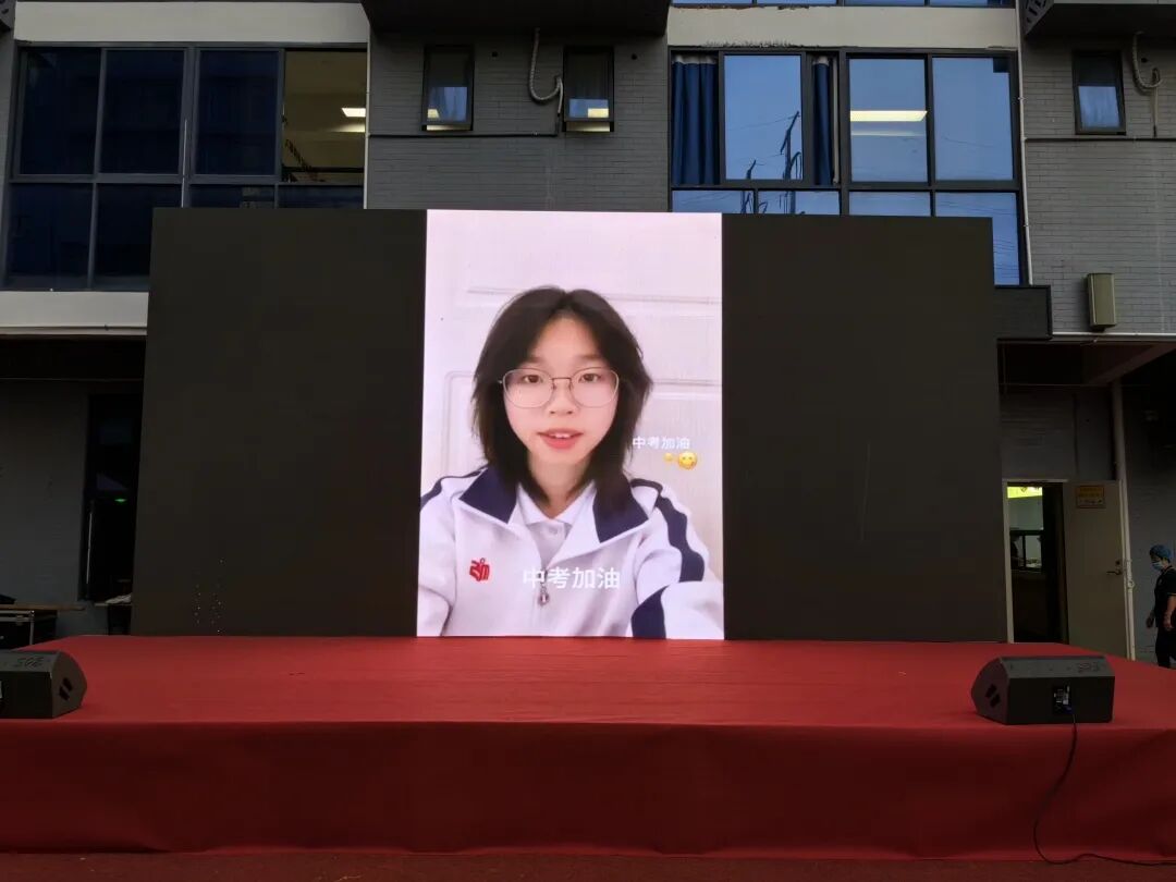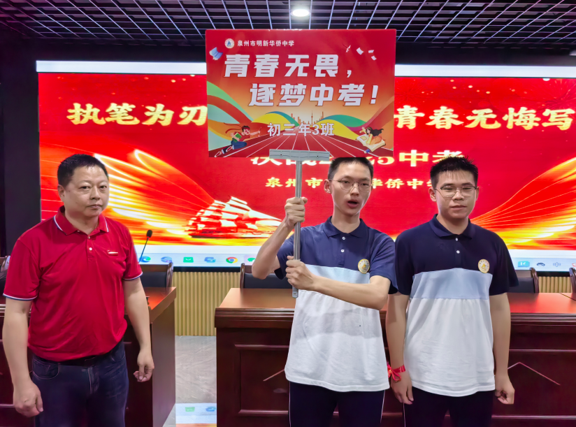 学生代表胡晓莎掷地有声:“全力以赴,中考必胜!拼搏到底,我必辉煌!”台下呼应声此起彼伏,同窗之情化作震耳欲聋的“明新必胜”!