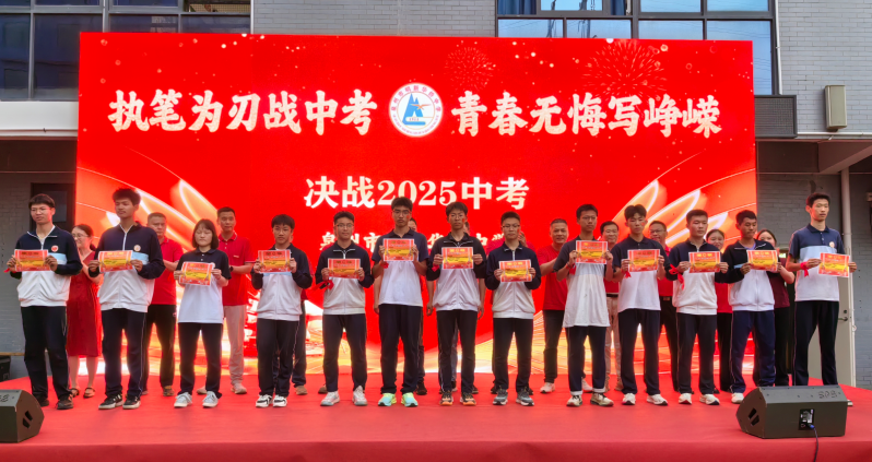 刘校长为各班授予励志牌,班级口号响彻云霄!“初三1班到!”“云程发轫,中考必胜!”,口号裹挟着青春的热血与锋芒,所有人昂首挺胸,眼中燃烧着必胜的火焰!