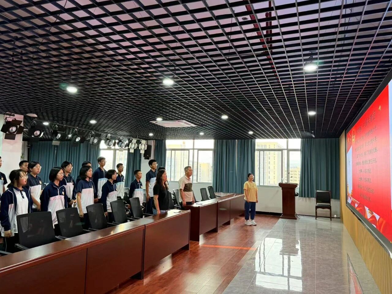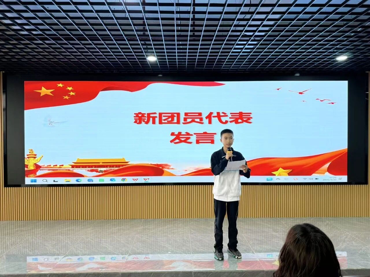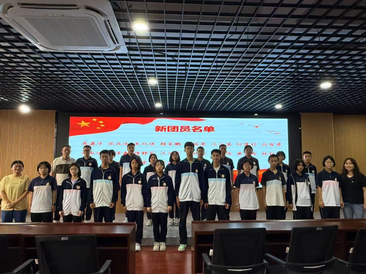大会在庄严的国歌声中拉开帷幕。校团委副书记、少先队大队辅导员张绵绵老师宣读新团员名单,吴潇洋、张成冰、朱双琪等22 名同学光荣加入中国共产主义青年团。学校领导与老团员代表为新团员佩戴团徽,象征着共青团精神的传承。面对团旗,新团员在团员代表金智炫的带领下庄严宣誓:“为共产主义事业而奋斗!” 铮铮誓言响彻会场,彰显明新侨中青年学子的责任与担当。