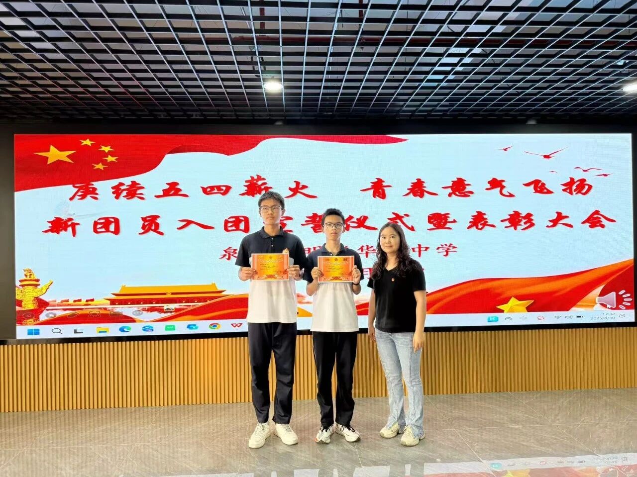 大会在激昂的团歌《光荣啊,中国共青团》中圆满落幕。此次活动既是对先进典型的表彰,更是一次生动的爱国主义教育课。泉州市明新华侨中学全体团员将以五四精神为指引,肩负时代使命,在拼搏中绽放青春光芒,续写无愧于时代的青春篇章。