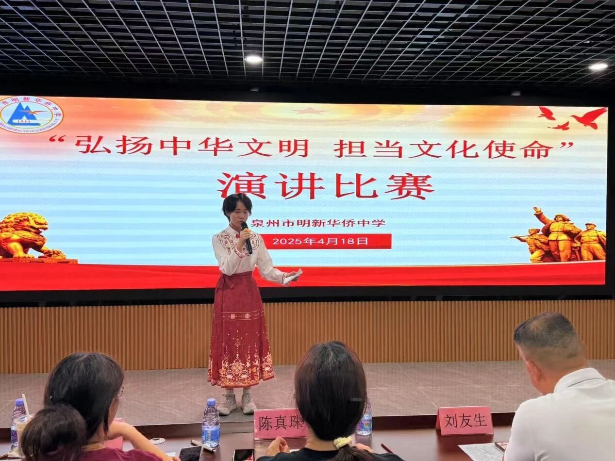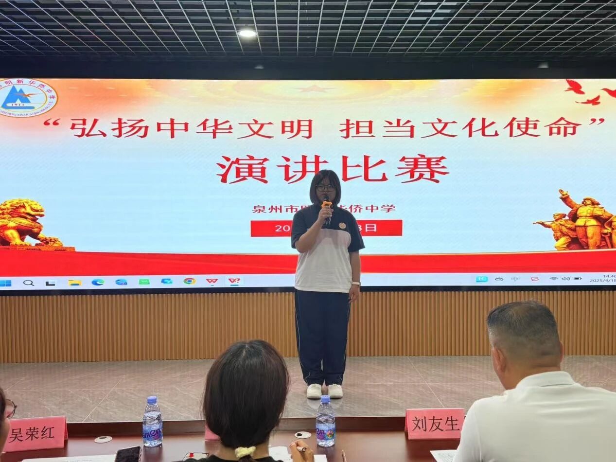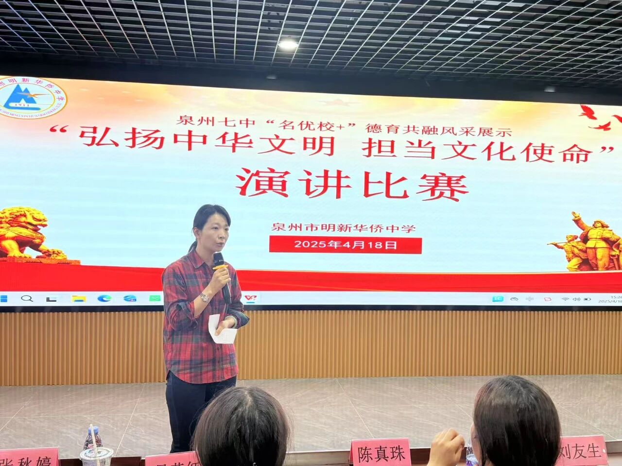 张秋婷老师:“同学们的演讲精彩纷呈,既有“家国情怀”的感染力,又有“以文化人”的穿透力,这恰是德育从课堂认知到生命践行的最美转化。此次演讲比赛不仅是泉州七中名优校+成员校教育的成果绽放,更是德育共融为文明传承注入的青春势能!让我们看到:名校教育赋予的不仅是知识图谱,更是将文化基因转化为使命担当的精神解码器。”