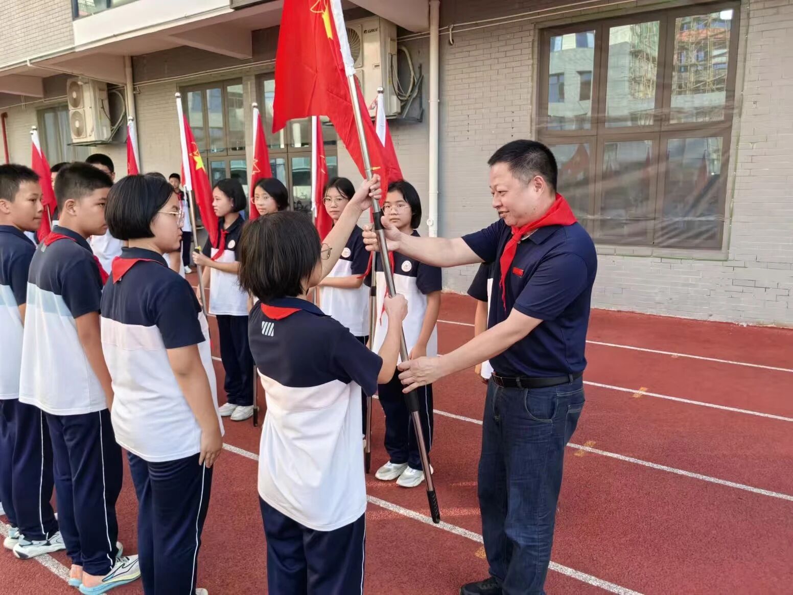 授旗仪式上,刘伟杰书记、校长、吴晋南副校长、刘友生副校长将鲜艳的中队旗授予各中队。各中队接过队旗,也接过了传承红色基因、担当强国使命的责任。