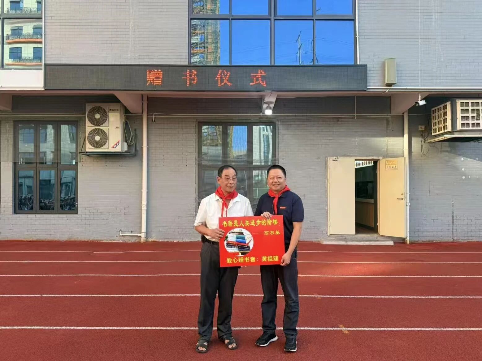 学校关工委副主任、退休教师黄祖建老师向学校赠送书籍,传递知识与关怀。刘伟杰书记、校长代表学校接受赠书。