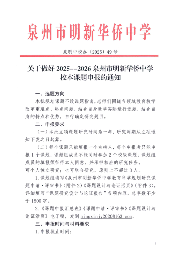 202549关于做好泉州市明新华侨中学2025秋课题申报的通知