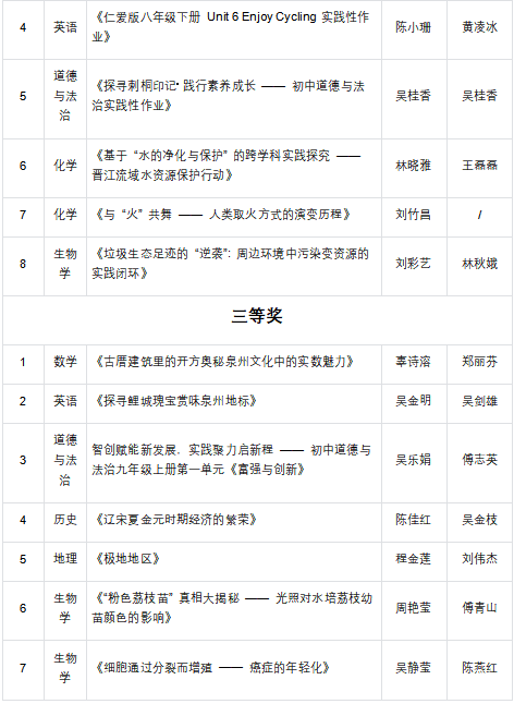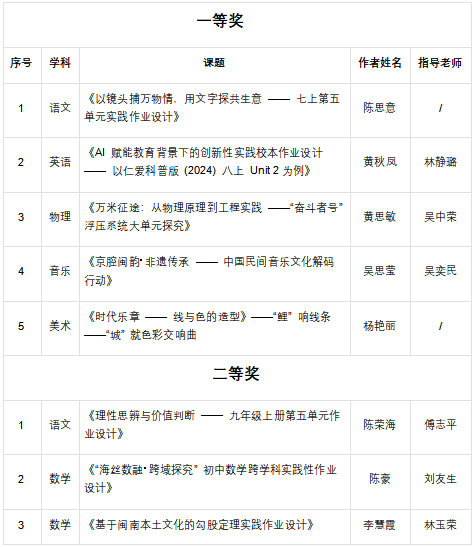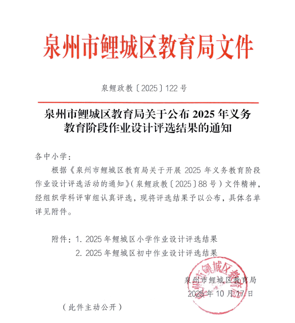 近日,2025年鲤城区义务教育阶段作业设计评选结果正式揭晓。我校教师在此次评选中表现卓越,共荣获一等奖5项、二等奖8项、三等奖7项,获奖总数达20项。参评的11个学科全部获奖,充分展现了我校教师扎实的教学功底与团队协作能力。