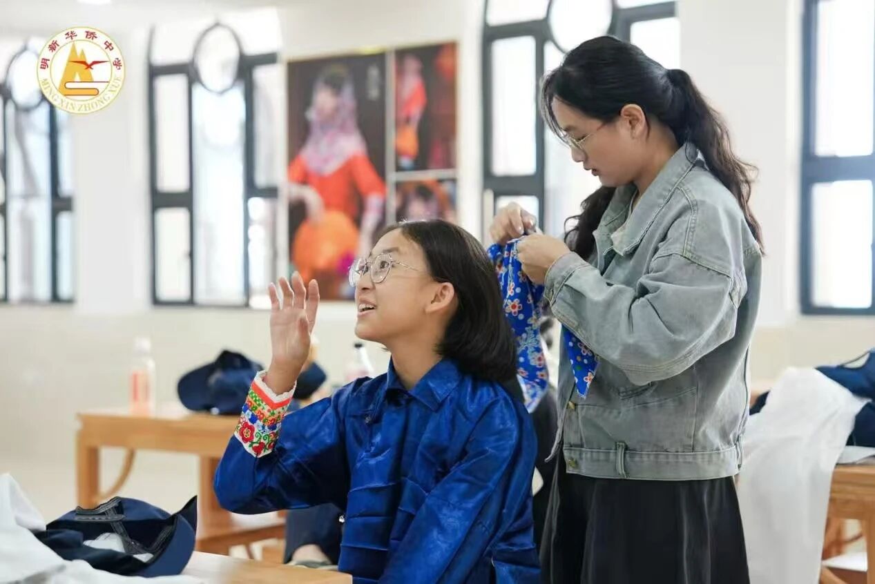 女生们化身“惠安女”,接过缀着银饰的头巾、色彩明艳的短衫,跟着老师学习“封建头、民主肚、节约衫、浪费裤”的服饰密码。有人对着镜子反复调整头巾褶皱,有人互相帮忙系紧腰带,当整套服饰穿戴整齐,摆出含蓄又明媚的笑容时,仿佛从闽南画卷里走出来的少女,定格下传统与青春碰撞的惊艳瞬间。