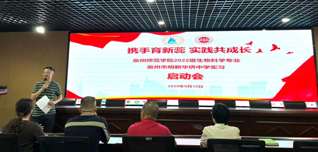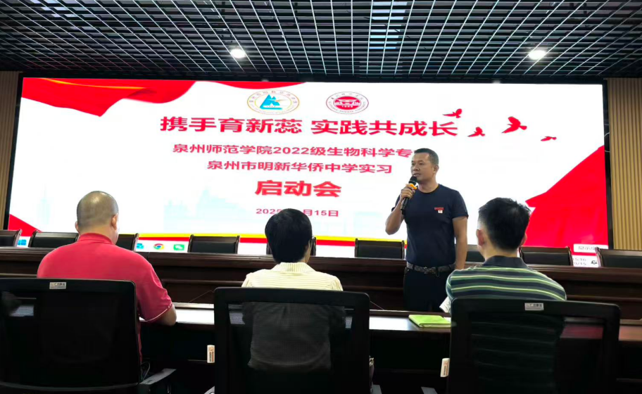 9月15日下午,我校为泉州师范学院2022级生物科学专业的实习生举行教育实习启动会。本次启动会以"携手育新蕊,实践共成长"为主题,明新华侨中学副书记吴剑雄、副校长吴晋南、副校长刘友生和各处室主任、学科指导老师、班主任代表,以及泉州师院带队老师陈细香、周明灿共同参会。