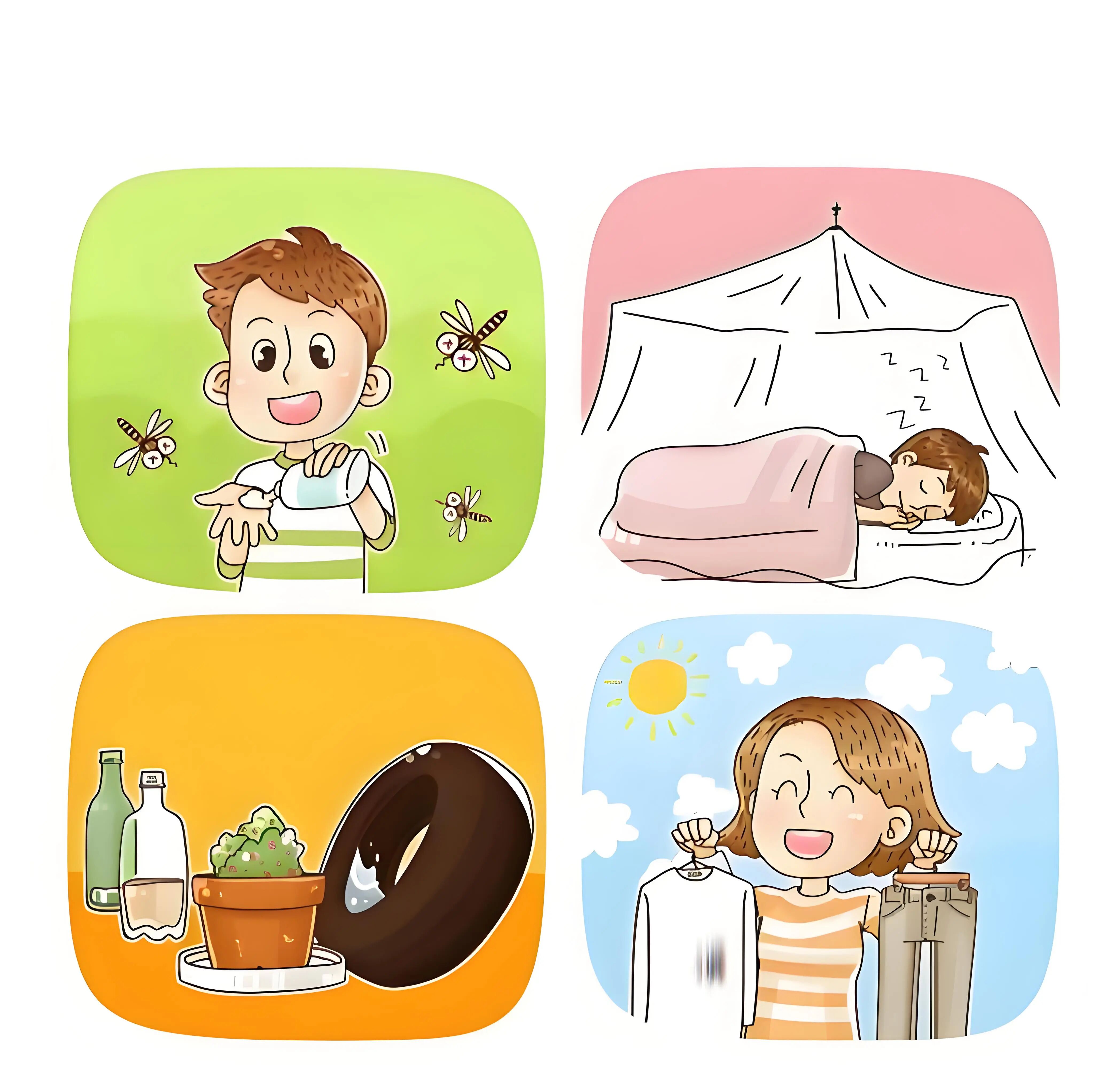 正确使用驱蚊产品:驱蚊剂可涂抹在暴露的皮肤或衣服上,选择含有避蚊胺、派卡瑞丁或伊默宁成分的产品,并按照说明使用。特别注意婴幼儿的使用限制,避免过量。