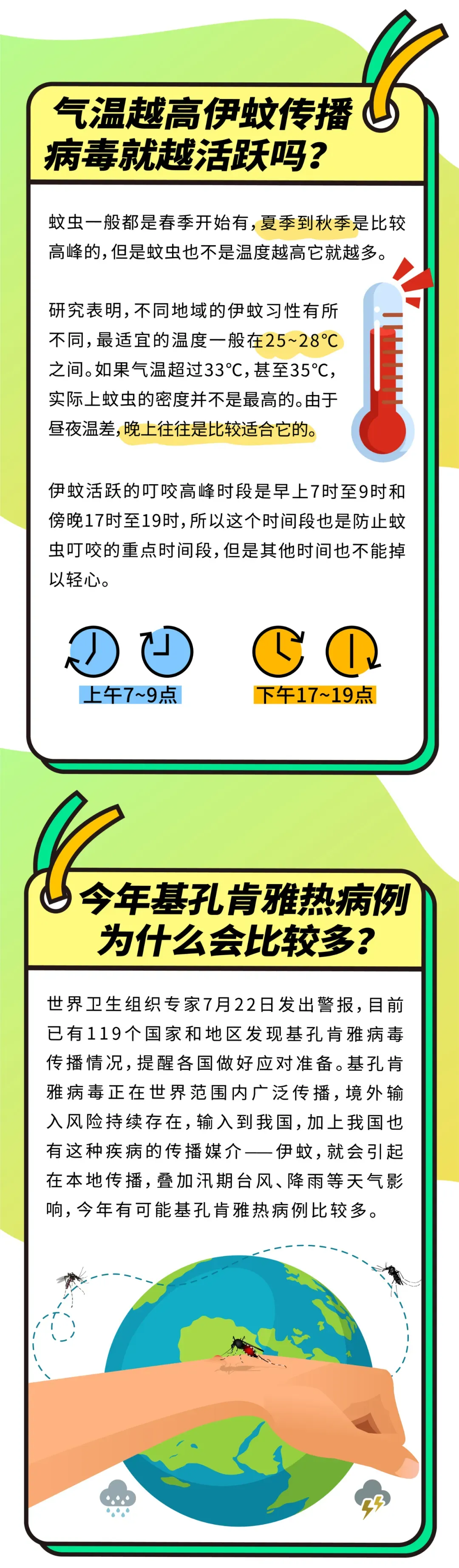 在花斑蚊活跃时段(上午7-10点、下午4-7点),尽量避免在树荫、草丛、凉亭等阴暗处停留;外出时穿浅色长袖衣裤,并在暴露的皮肤及衣物上使用含避蚊胺、驱蚊酯、派卡瑞丁、柠檬桉叶油等成分的驱蚊产品。