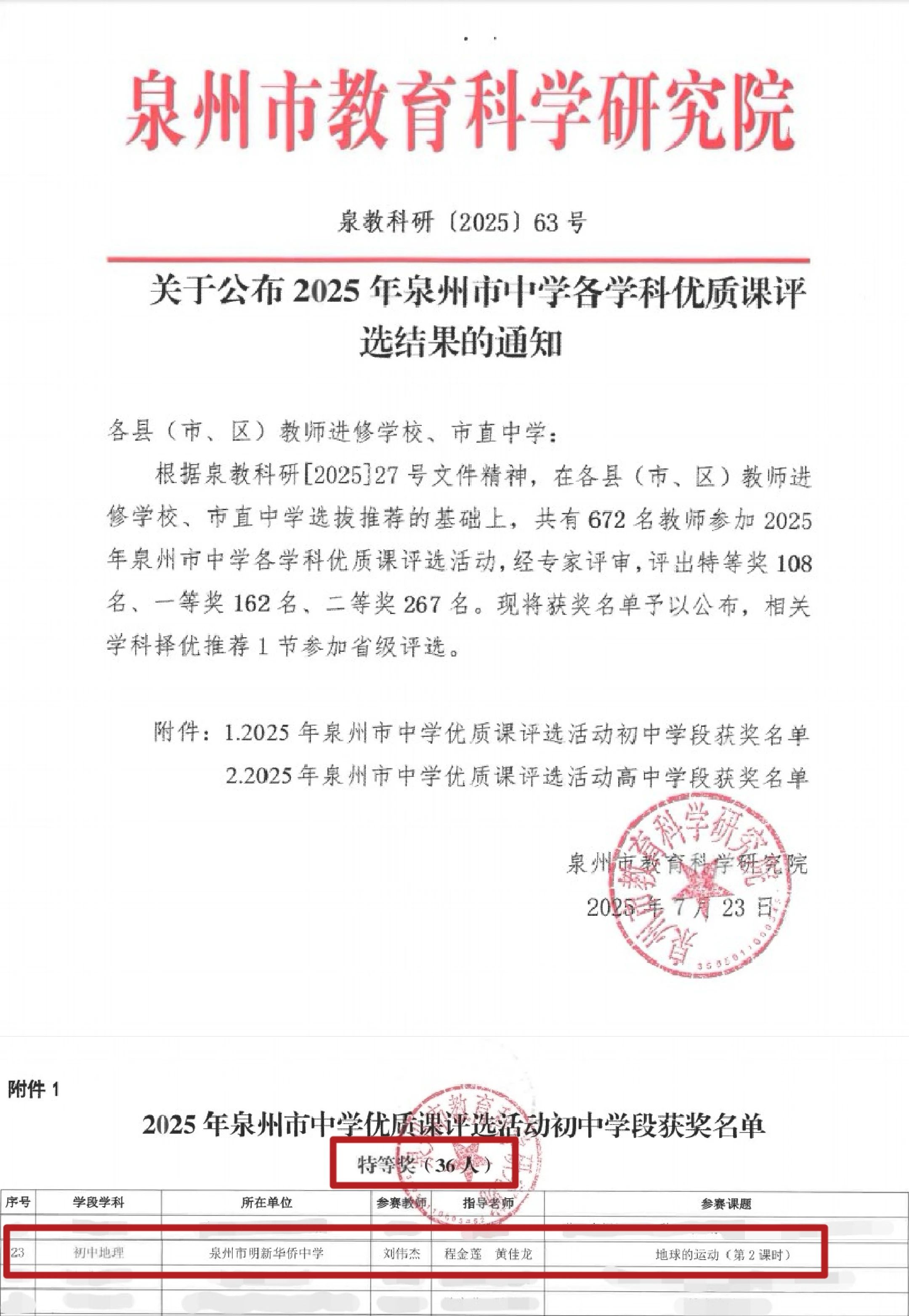 本次市级优质课评选竞活动先由各县(市、区)进行严格选拔,各县区第一名晋级市级决赛。在最终的市级现场授课环节,初中学段地理学科的18位老师同台竞技,经过专家评委的严格评审,共评出特等奖3名、一等奖4名、二等奖7名。刘伟杰老师摘得特等奖桂冠,并位列所有获奖选手之首。其课堂充分展现了我校教师先进的教育理念、扎实的专业素养和卓越的育人能力。