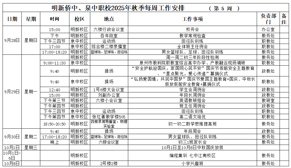 【09月28日 星期日】 2025年秋季第05周工作安排