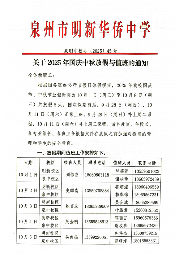 泉明中校办(2025)45号 关于2025年国庆中秋放假与值班的通知