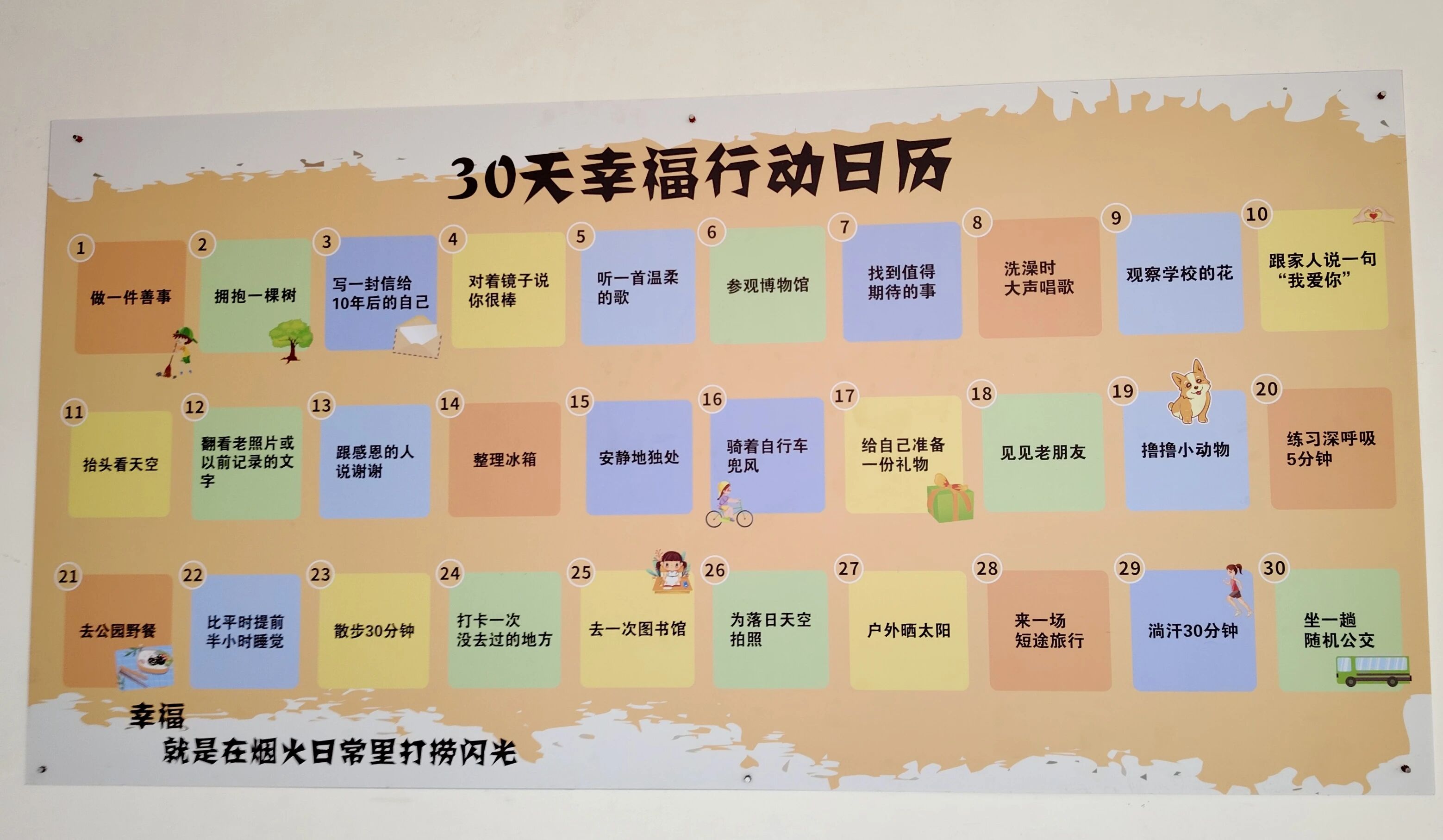 心理文化节活动期间,向同学们发放 “幸福行动日历”:整理冰箱、骑行等身体劳动疏解情绪,以秩序感重建内心平衡;观察花草、记录落日等,用劳动视角记录、探索、创造发现生活诗意;致谢、野餐等互动中,借劳动准备强化情感联结,予心灵温度。