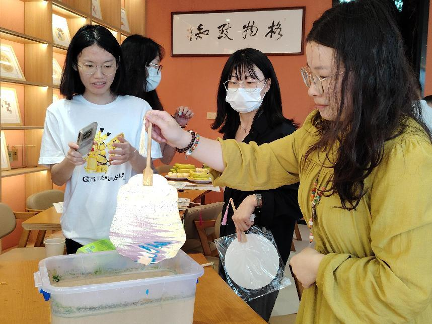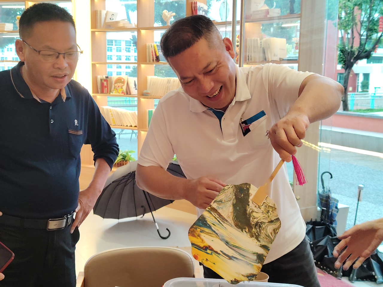活动伊始,在学生志愿者的指导下,教师们纷纷动手制作漆扇,教职工们根据自己想象或喜欢的漆色,将漆液滴入清水中,轻轻吹动、搅动,使漆在清水面上自然散开。接着,晃动、旋转扇子,以漆为笔,以水为墨,在扇子上一笔一画地描绘着自己的创意和想象,“独一无二”的彩色漆扇在教职工们手中逐渐成型。一把把原本平凡的扇骨逐渐蜕变成为一把把精美绝伦的漆扇。