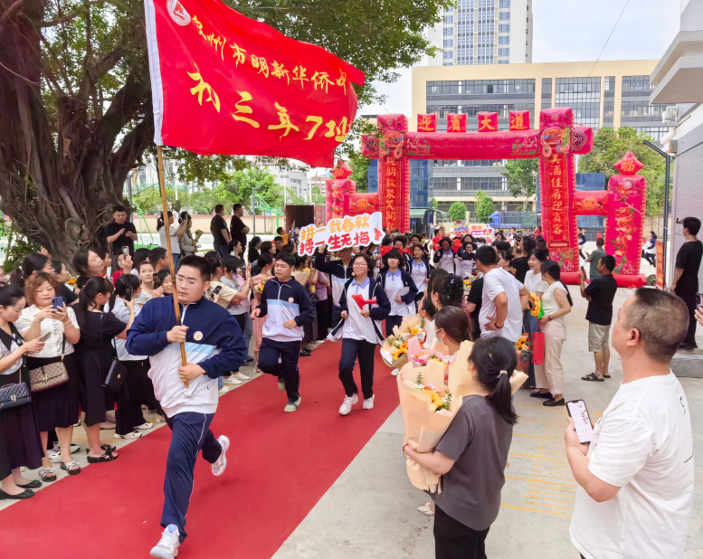 家长手捧鲜花欢呼,教师团队振臂呼应——这一刻,明新人的心紧紧相连!