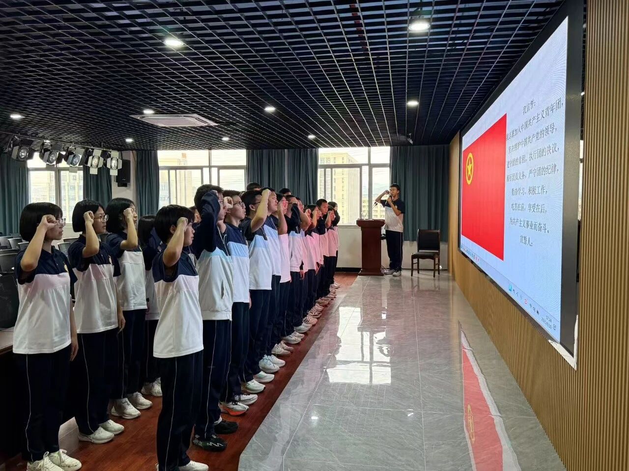 大会在庄严的国歌声中拉开帷幕。校团委副书记、少先队大队辅导员张绵绵老师宣读新团员名单,吴潇洋、张成冰、朱双琪等22 名同学光荣加入中国共产主义青年团。学校领导与老团员代表为新团员佩戴团徽,象征着共青团精神的传承。面对团旗,新团员在团员代表金智炫的带领下庄严宣誓:“为共产主义事业而奋斗!” 铮铮誓言响彻会场,彰显明新侨中青年学子的责任与担当。