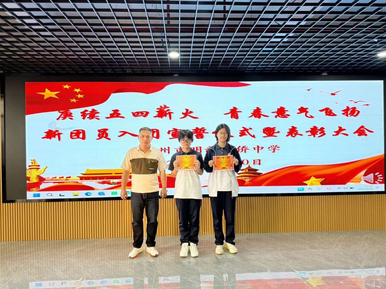 大会在激昂的团歌《光荣啊,中国共青团》中圆满落幕。此次活动既是对先进典型的表彰,更是一次生动的爱国主义教育课。泉州市明新华侨中学全体团员将以五四精神为指引,肩负时代使命,在拼搏中绽放青春光芒,续写无愧于时代的青春篇章。