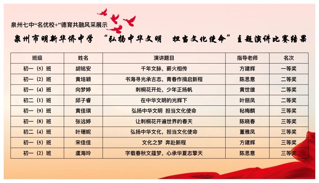 张秋婷老师:“同学们的演讲精彩纷呈,既有“家国情怀”的感染力,又有“以文化人”的穿透力,这恰是德育从课堂认知到生命践行的最美转化。此次演讲比赛不仅是泉州七中名优校+成员校教育的成果绽放,更是德育共融为文明传承注入的青春势能!让我们看到:名校教育赋予的不仅是知识图谱,更是将文化基因转化为使命担当的精神解码器。”
