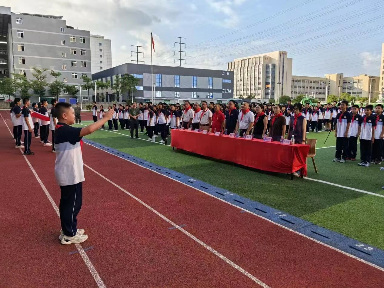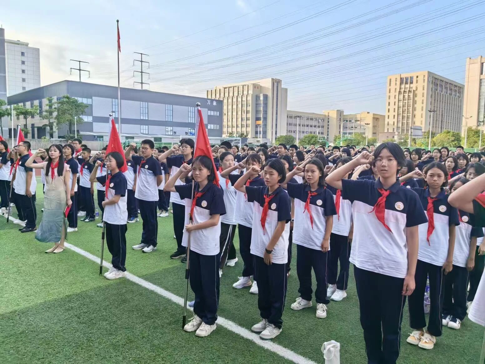 “准备着,为共产主义事业而奋斗!”大队辅导员领呼,全体队员齐声回应:“时刻准备着!”呼号声响彻校园,彰显出少先队员的昂扬斗志。