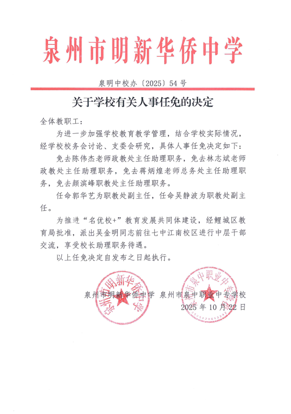 202554泉州市明新华侨中学(泉中职校)关于学校人事任免决定